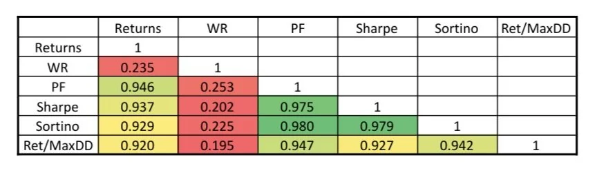 Over the years, I have considered numerous metrics while working on signal generation projects. Below is a correlation matrix of metric values across many different param values in the backtest output from a directional trading strategy. It is a blend of breakout trading and reversion trading, so the one uncorrelated metric is Win Rate.